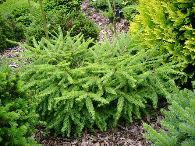Ель обыкновенная Procumbens - карликовый кустарник до 0,5 м высотой и 2-3 м шириной. Крона плоская, широкая. Ежегодный прирост в высоту 3-4 см, в ширину 10 см. Хвоя густая, очень жесткая на ощупь, ярко-зеленая, 10 - 17 мм длиной (самая длинная среди всех плоскорастущих форм). Теневынослива, но лучше развивается при достаточном освещении. Требования к почве и влаге невысоки. Переносит временное избыточное увлажнение. Морозостойка. Отлично подойдет для одиночных посадок в небольших садах, альпийских горках, альпинариях.