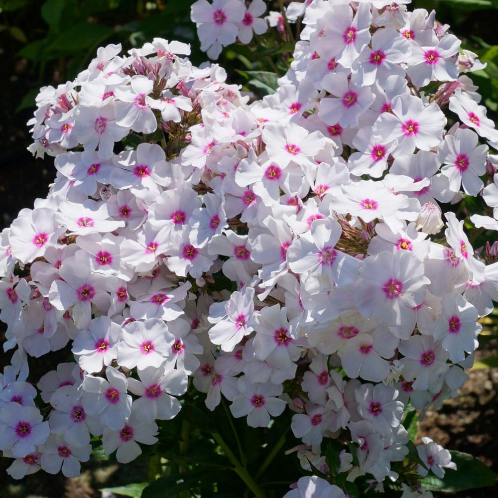 Метельчатый флокс Europe белый с карминным колечком. Цветок колесовидной формы. Соцветие пирамидальное, большое, плотное, красиво сложенное. Куст компактный, мощный, плотный, прямостоячий, прочный, хорошо облиственный, красивый, быстро разрастается. Легко размножается. Диаметр цветка 3,5-3,8 см, высота растения 70-90 см. Срок цветения средний (конец июля - начало августа) - среднепоздний (начало августа - середина августа).