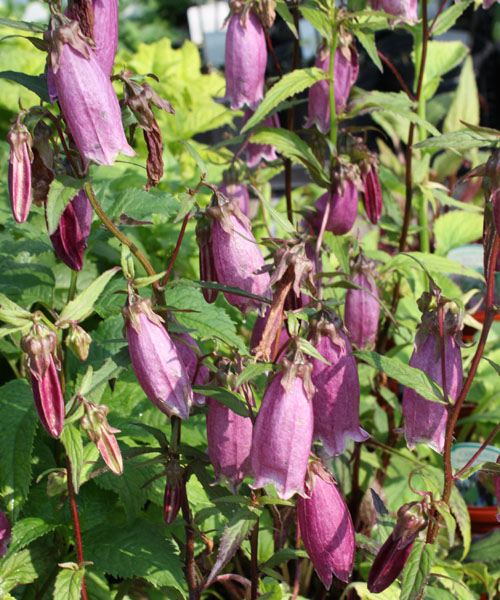 Колокольчик точечный Вайн ин Рубиз: Цветки большие тёмно-пурпурно-красные, создают красивый контраст с пурпурными стеблями и тёмно-зелёными листьями, отлично подходит для выращивания в контейнерах