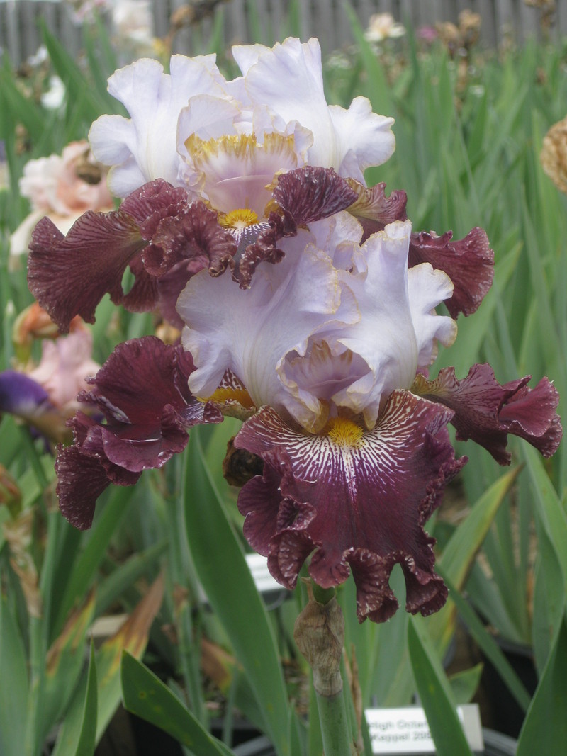 Рассада ириса Magic Masquerade привлекает любителей крупных цветов. Высота цветоносов у этого сорта более 110 см. Окраска яркая, основана на единстве контрастов. Стандарты (верхние доли) – белые с легким лавандовым оттенком и тончайшей желтой окантовкой по краям, фолы (нижние доли) – темно- фиолетовые с краснотой и белыми тонкими штрихами у основания. Бородка – желтая небольшая. На обратной стороне нижних лепестков – белое точечное покрытие. Цветок – гофрированный. Цветет поздно, осенью. Обладает сладковатым запахом. Привлекает пчел и других насекомых.