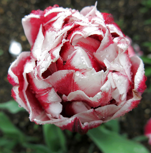 Тюльпан Wirosa - махровый поздний сорт. Зацветает в мае. Высота растения в среднем составляет 25-40 см. Форма цветков пионовидная. Насыщенный винно-красный оттенок лепестков постепенно изменяется на более нежный розовый тон. По краю лепестка проходит широкая кремовая полоса.